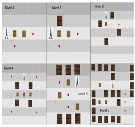 Las fichas se hacen a partir de unos cubos de anime, los cuales se pintan para representar bloques, cajas y el jugador. Por último, deben recortar pequeñas esferas de color rojo que representarı́a el lugar donde deben ubicar la(s) caja(s). A continuación, se presentan los diferentes niveles de dificultad del juego, como se muestra en la siguiente figura (Ver Figura 6):