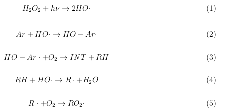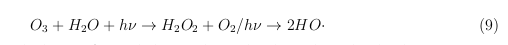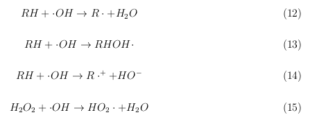 en agua natural que contiene materia orgánica disuelta (MOD) y/o NO3−, independientemente de su perfil de absorción. El radical hidroxilo más reactivo (·OH) oxida un grupo alquilo y un anillo aromático de una manera relativamente no selectiva. El oxı́geno singlete (1O2) reacciona con un resto insaturado rico en electrones para dar hidroperóxido, 1,2-dioxetano o endoperóxido, y también participa en la oxidación del azufre y la oxigenación de los heterociclos.