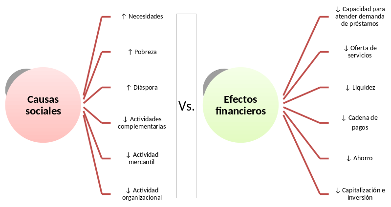 Decrecimiento en la liquidez. Las cajas no cuentan con la liquidez necesaria para satisfacer la demanda, ya que no perciben ingresos recurrentes por concepto de venta de CCP, nuevos ahorros o intereses cobrados sobre préstamos. Esta situación ha creado un cı́rculo vicioso en el cual algunos socios han perdido interés en solicitar préstamos porque las cantidades son irrisorias, y las cajas no pueden otorgar préstamos porque no cuentan con liquidez.