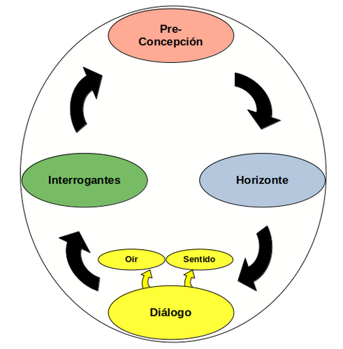 la Pre-concepción, el Horizonte, el Diálogo (oír/sentido) y las Interrogantes. Esta centralidad